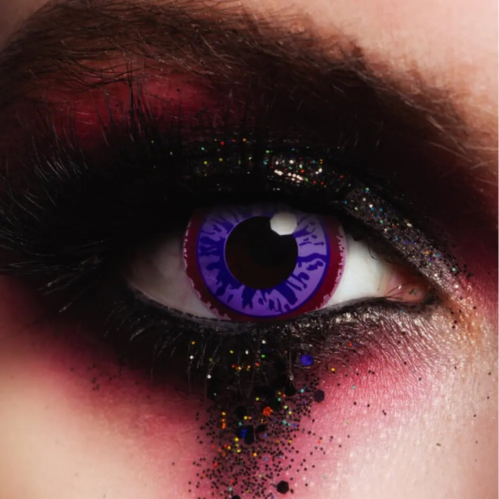 The crazy coloured contact lenses are Purple with a two tone of white and dark purple, completely covering your natural eye colour giving you the professional horror star look.