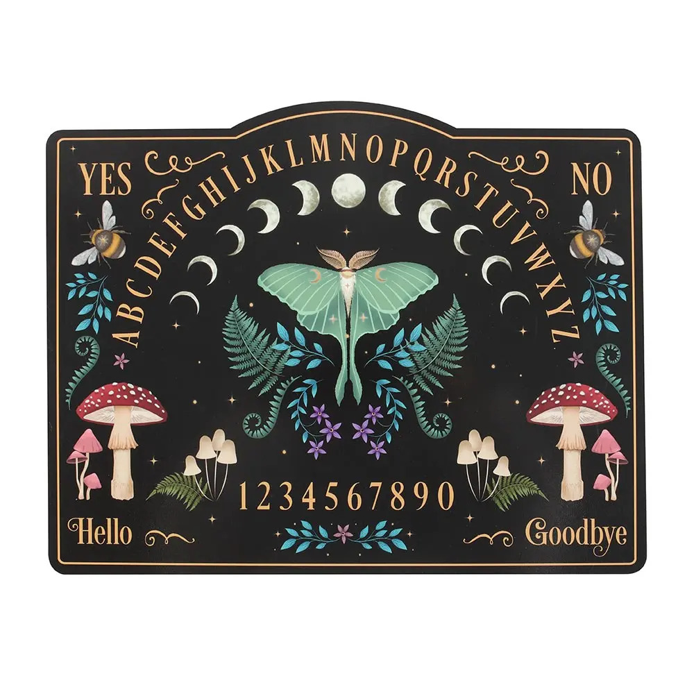 This beautifully designed spirit board showcases a whimsical, nature-inspired aesthetic that blends mystical symbolism with enchanting artwork. Featuring a central Luna moth surrounded by moon phases, botanical elements, mushrooms, and celestial accents, the board provides a visually striking surface for divination or decorative display. The alphabet and numeric layout are presented in elegant gold lettering, along with clear “Yes,” “No,” “Hello,” and “Goodbye” indicators. Crafted with an artistic fantasy theme, this board serves as a captivating centerpiece for spiritual practice, meditation, or as a unique gift for those drawn to occult or metaphysical décor.