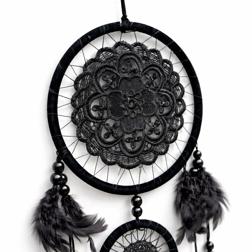 Dreamcatchers are traditionally believed to protect against negative energy while allowing positive dreams to pass through. The deep black colour adds a modern, mysterious aesthetic, making it ideal for bedrooms, living rooms, meditation areas, or alternative home decor styles.