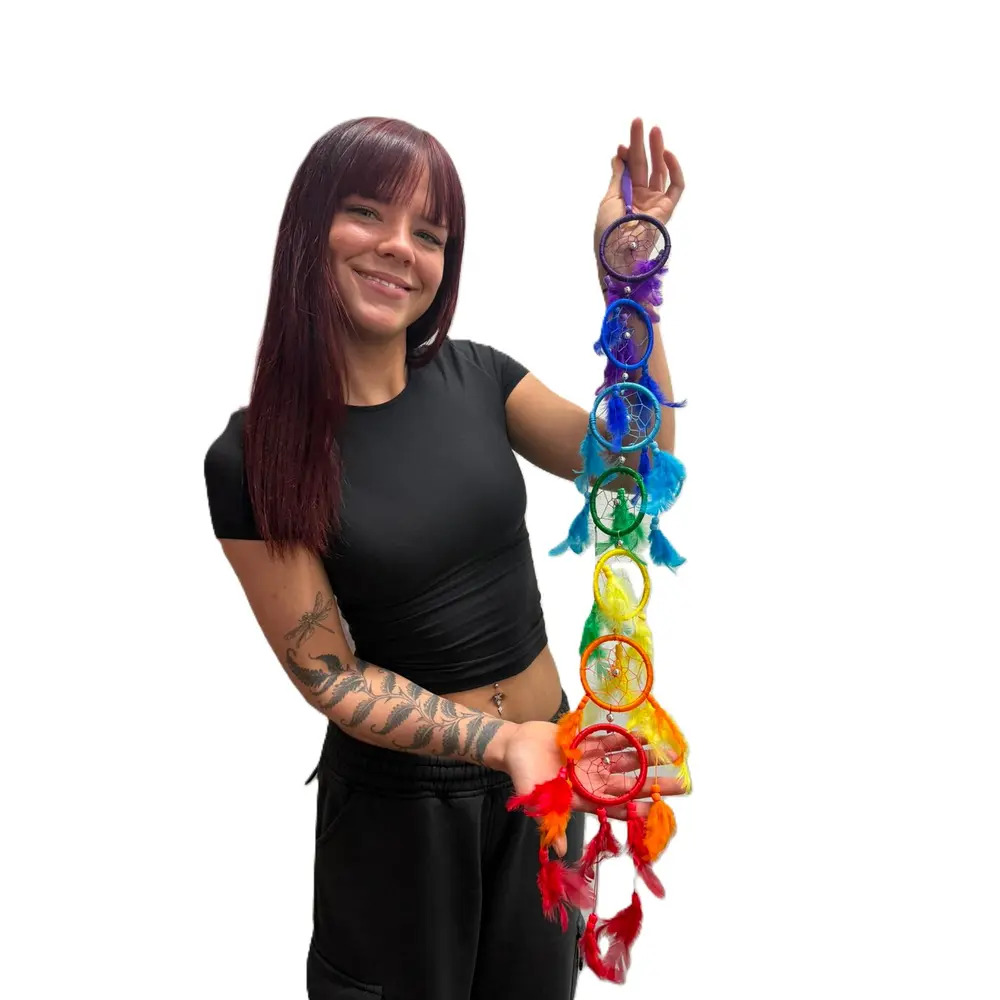 Finished with soft, colourful feathers and detailed webbing, it makes a striking statement in bedrooms, living rooms, meditation spaces, festival setups, or camper vans. The rainbow design is often associated with chakra alignment and spiritual wellbeing, making it both decorative and meaningful.