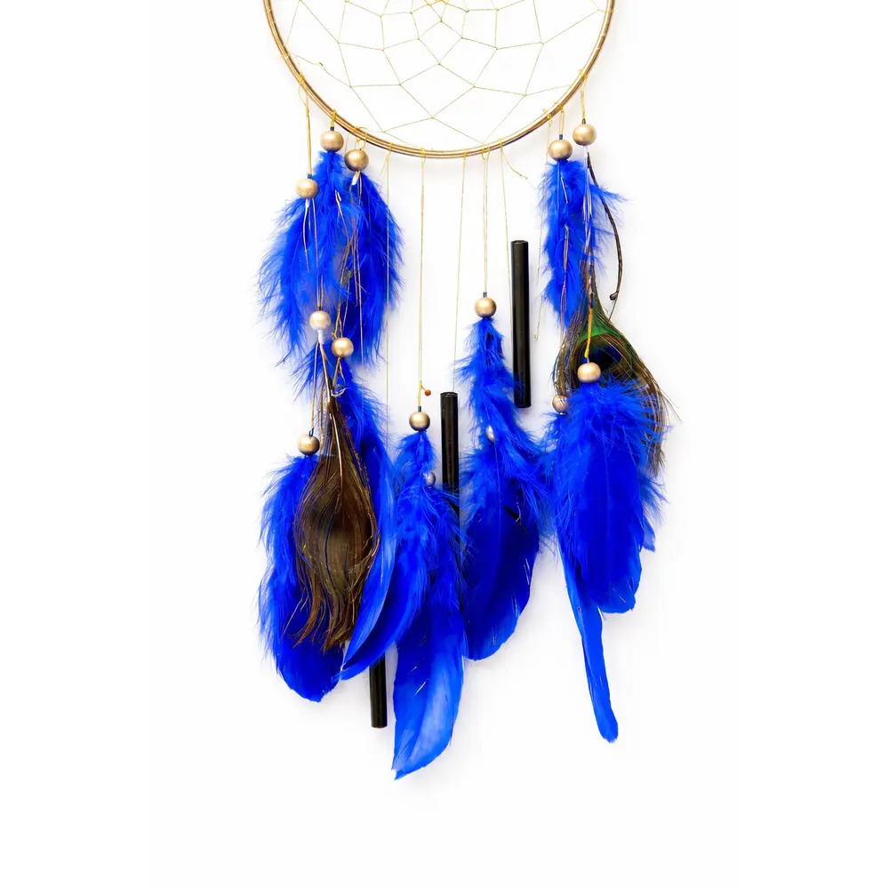 SKU: DC7878Add a bold and striking accent to your space with this stunning Royal Blue & Black Dream Catcher. Featuring a golden webbed centre delicately crafted to catch dreams, it is framed by a sleek metallic hoop for a sophisticated look. The cascading royal blue feathers, accented with black feathers and golden beads, create a vibrant yet mysterious aesthetic. Hanging below are black wind chimes that not only add elegance but also produce soft, melodic tones, enhancing the calming energy of this piece.