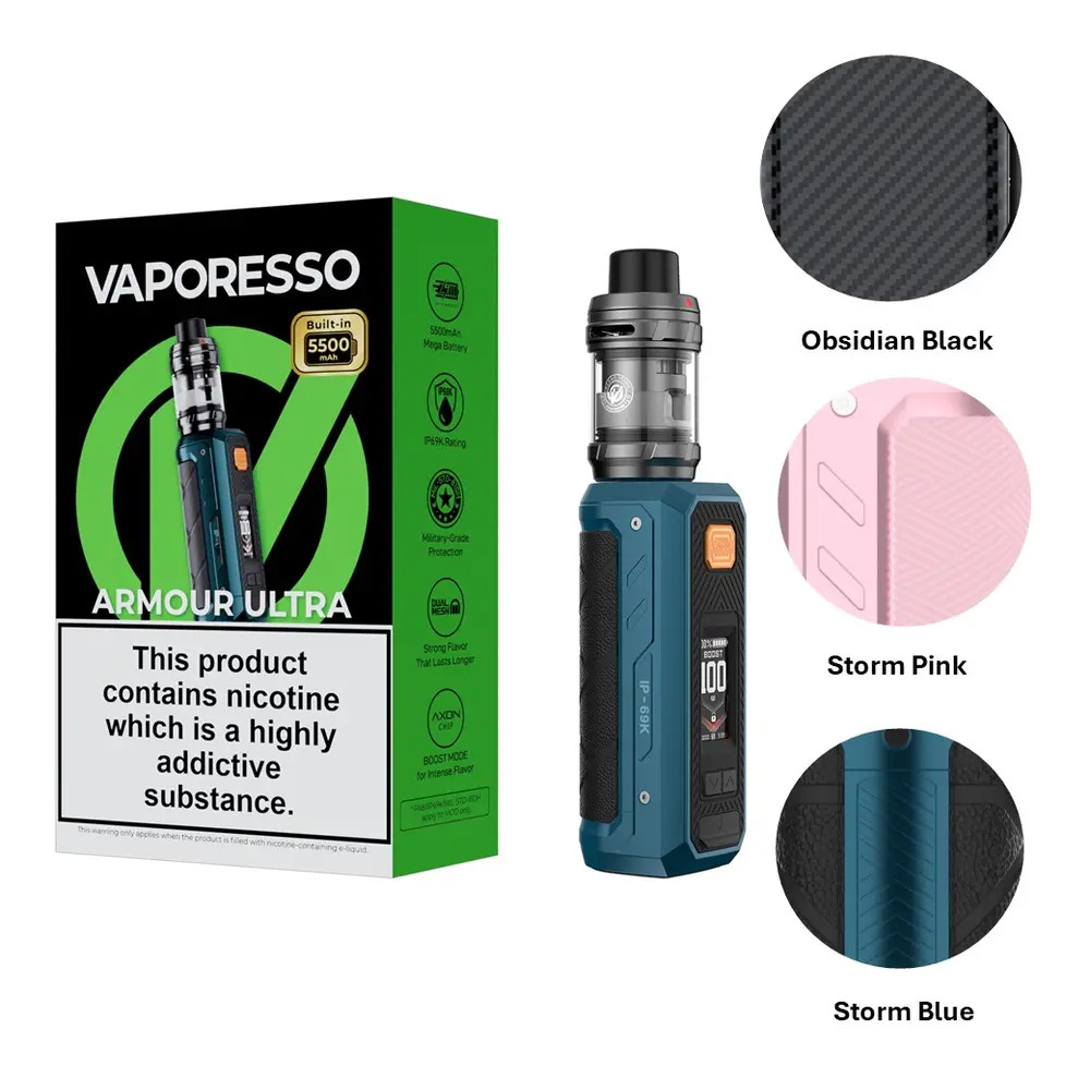 Part of Vaporesso’s rugged Armour range, the Armour Ultra is designed to go the distance. It features quad-rated protection, including IP68 and IP69K water and dust resistance, MIL-STD-810H military-grade certification, and enhanced shock protection. Powered by Vaporesso’s intelligent AXON chipset and paired with the iTank T for smooth airflow and rich flavour, the Armour Ultra stands as Vaporesso’s most advanced and complete DTL vaping kit to date.